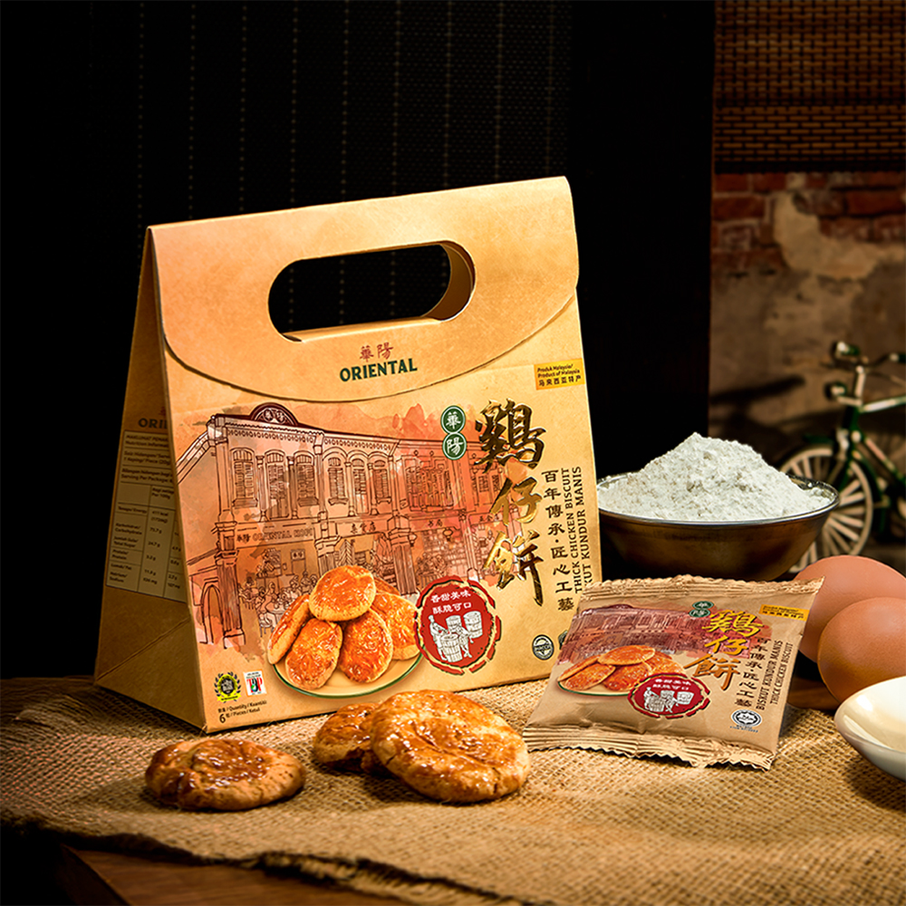 “鸡仔饼”一款家喻户晓的传统土产! 精选上好冬瓜调制柔嫩香甜内馅,搭配酥脆饼皮,皮薄馅厚,再以慢火烤烘至金黄! 出炉后的鸡仔饼咸中带甜,具有甘、香、酥、甜、咸的丰富层次,尝上一口,让您回味无穷!